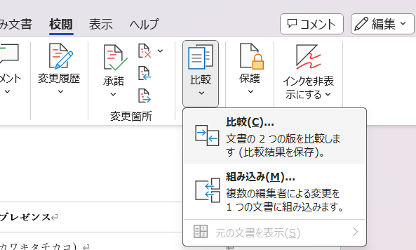 新旧対照表を作成するには、比較とマージ 機能を使用します。この機能は、Word に標準搭載されており、簡単に使用できます。文書の改訂前と改訂後のバージョンを選択し、比較 ボタンをクリックするだけで、新旧対照表が自動的に生成されます。