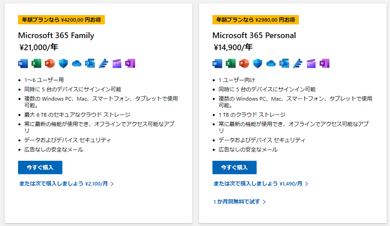 Microsoft 365 PersonalとMicrosoft 365 Familyの比較