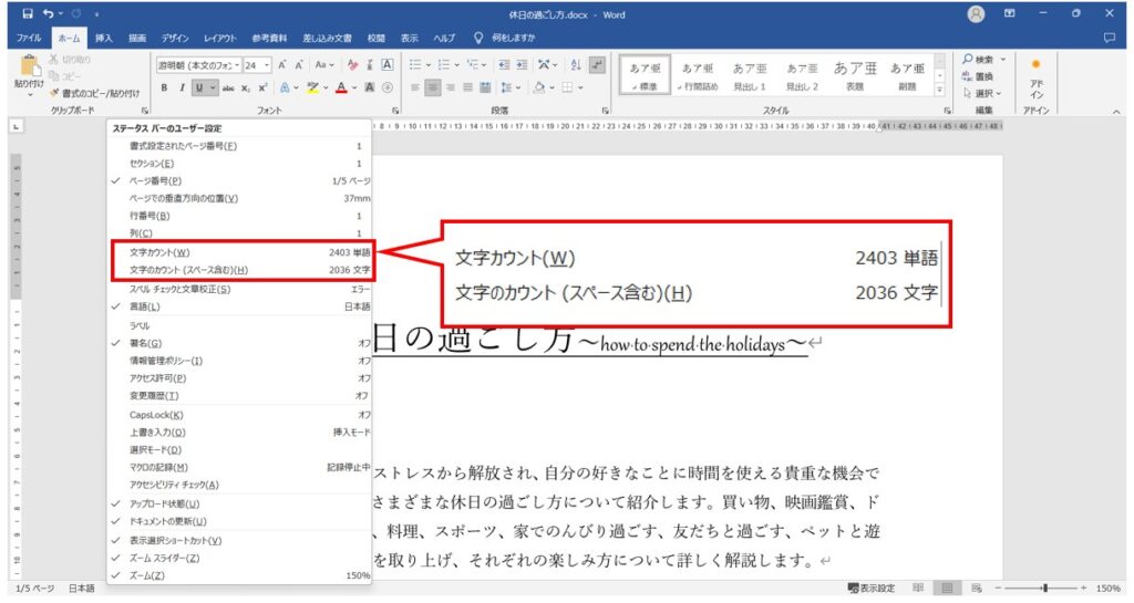 Word の設定によって、文字数カウントと単語数の見方は異なります。Word のオプション で、ステータスバー の設定を変更することができます。ステータスバー の設定を変更すると、文字数と単語数の表示が変更されます。また、Word のテンプレート で、文字数と単語数の表示を設定することもできます。