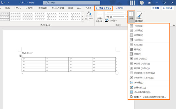 リーダー線を削除するには、表内のセルを選択し、ホーム タブの 段落 グループにある ボーダー ボタンをクリックします。次に、リーダー線 を選択し、なし を選択してください。リーダー線を削除することで、表のレイアウトを簡単に変更できます。