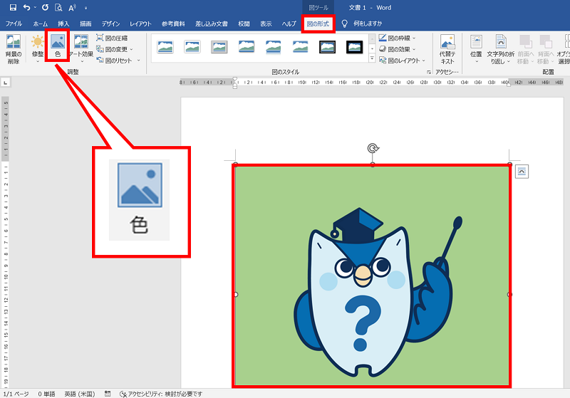 画像を選択した後、フォーマットタブが表示されます。フォーマットタブには、画像のサイズ、位置、回転などの設定オプションがあります。画像の背景を透明にするには、フォーマットタブのカラーの調整グループの中にあるオプションを使用します。