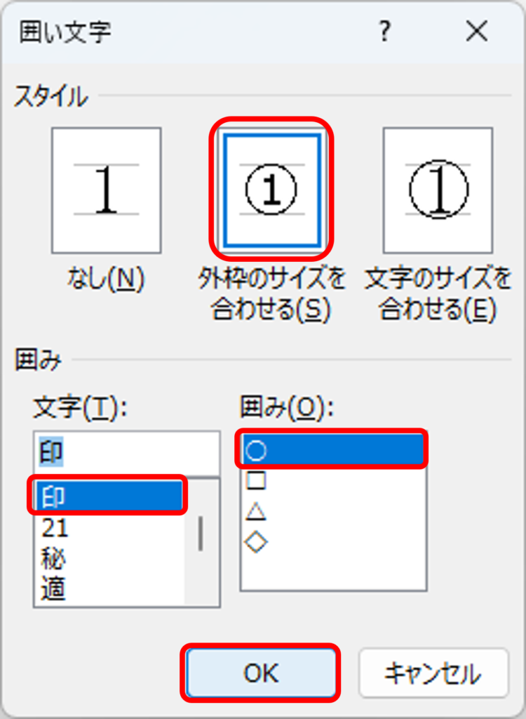 このダイアログボックスで、「囲み」を選択し、丸印 の種類を選んで「OK」をクリックします。丸印の種類には、黒丸、白丸、黒四角 などがあり、それぞれ異なる意味を持っています。例えば、黒丸は選択肢の選択を示すために使用され、白丸は選択肢の未選択を示すために使用されます。