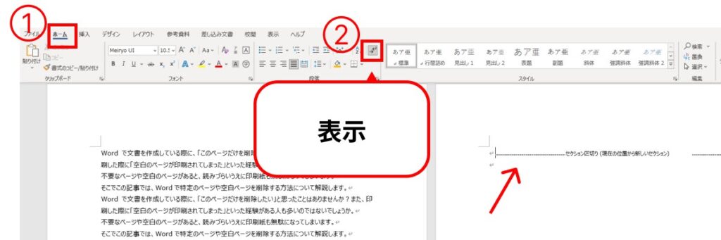 ページ区切りを表示するには、非印刷文字 を表示する必要があります。ホーム タブを開き、段落 グループの 非印刷文字 をクリックします。すると、ページ区切りを含む非印刷文字が表示されます。ページ区切りは、¶ 記号で表示されます。