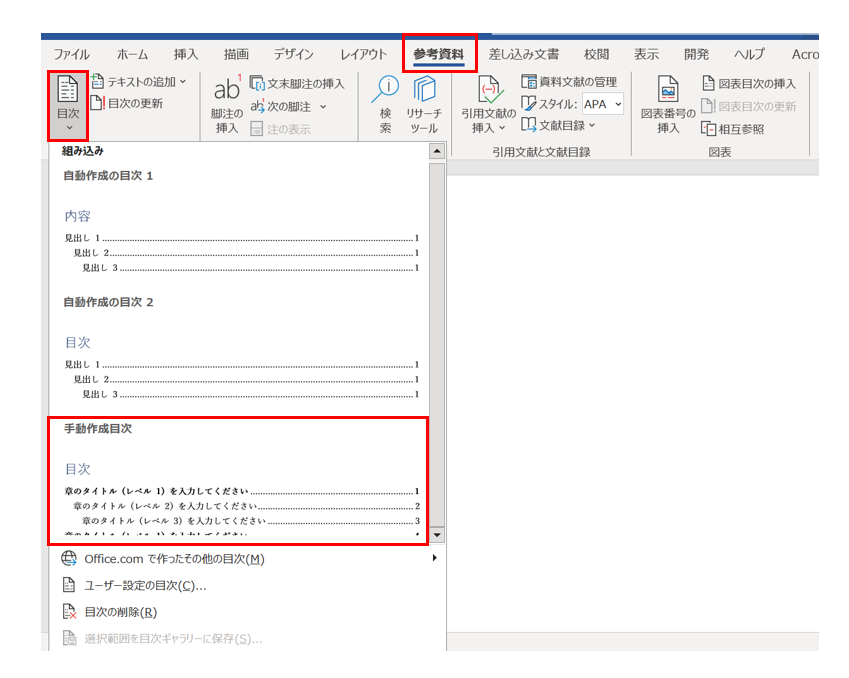 目次の自動作成は、文書の先頭にカーソルを置き、参照リボンにある目次をクリックし、目次のスタイルを選択することで実行できます。この機能により、文書の見出しレベルに基づいて目次が自動的に生成され、読み手が文書の構造を簡単に理解できるようになります。